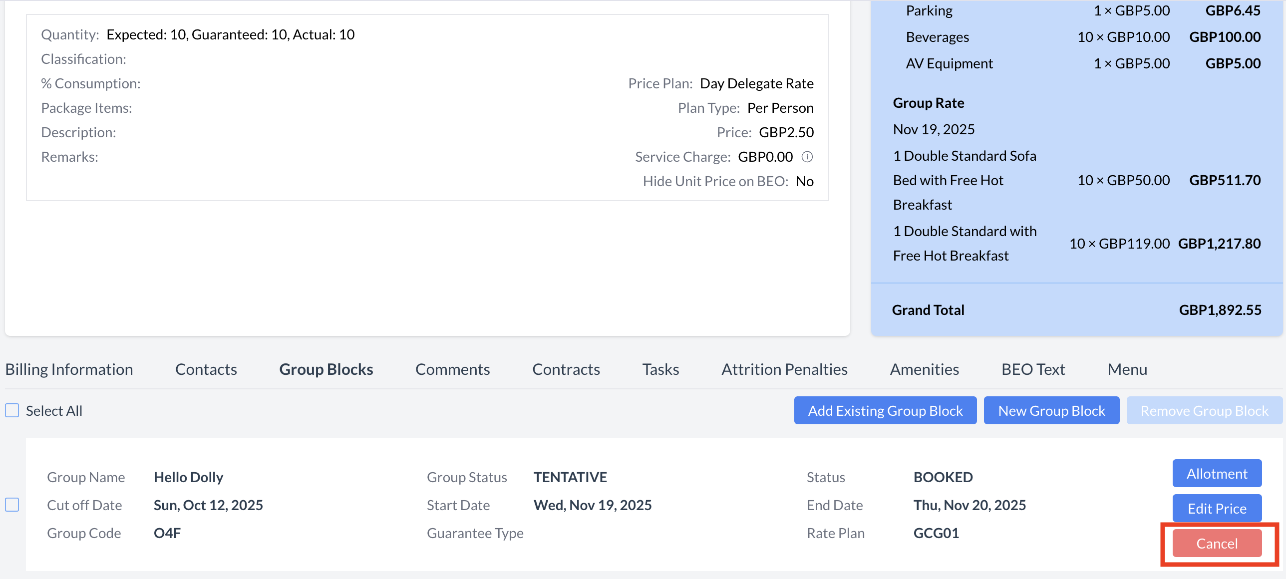 ❌ Cancelling a Group BlockIf the group block is no longer needed, you can cancel it directly from the Group Blocks section of the Event Record. Steps to Cancel: