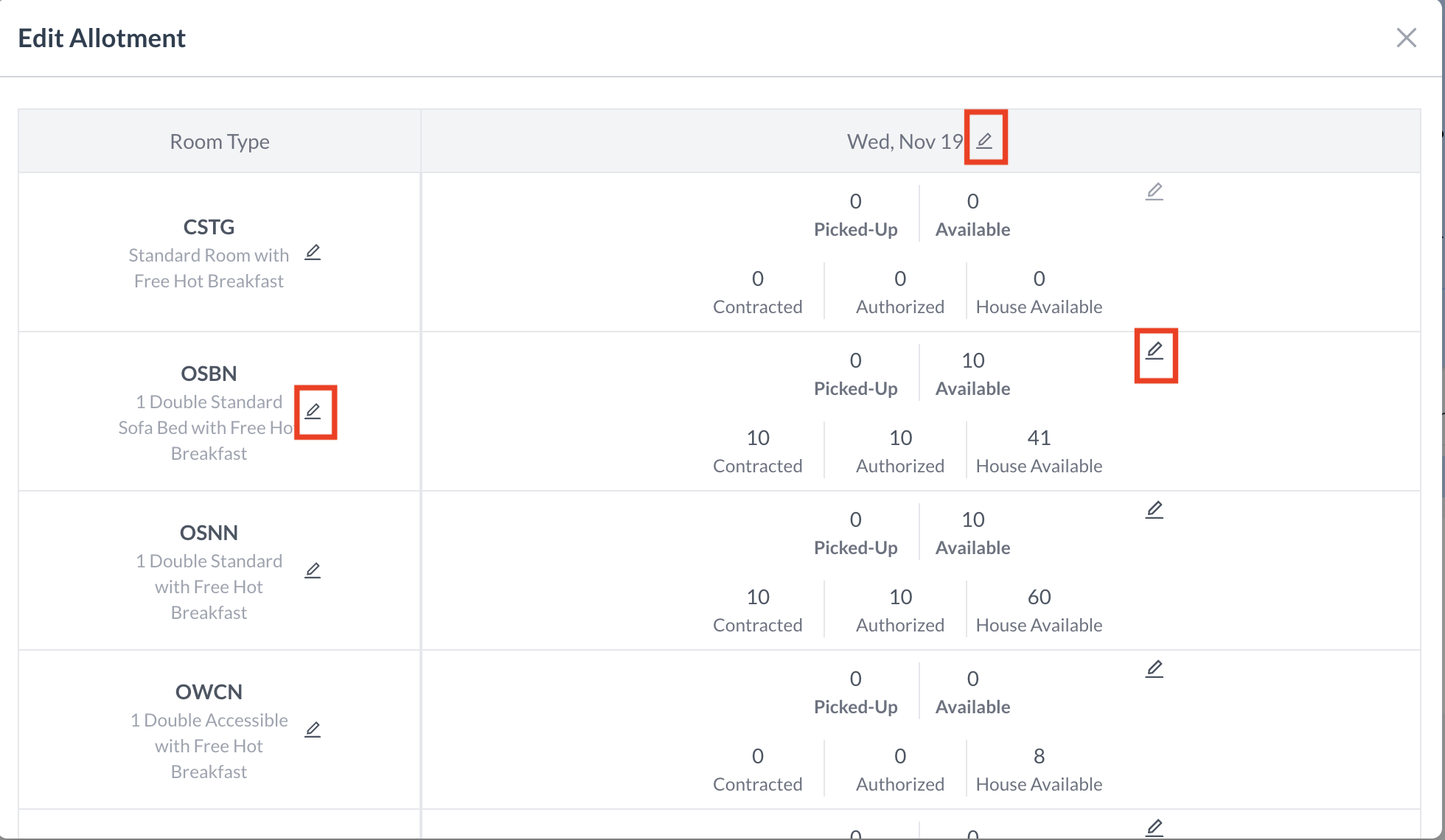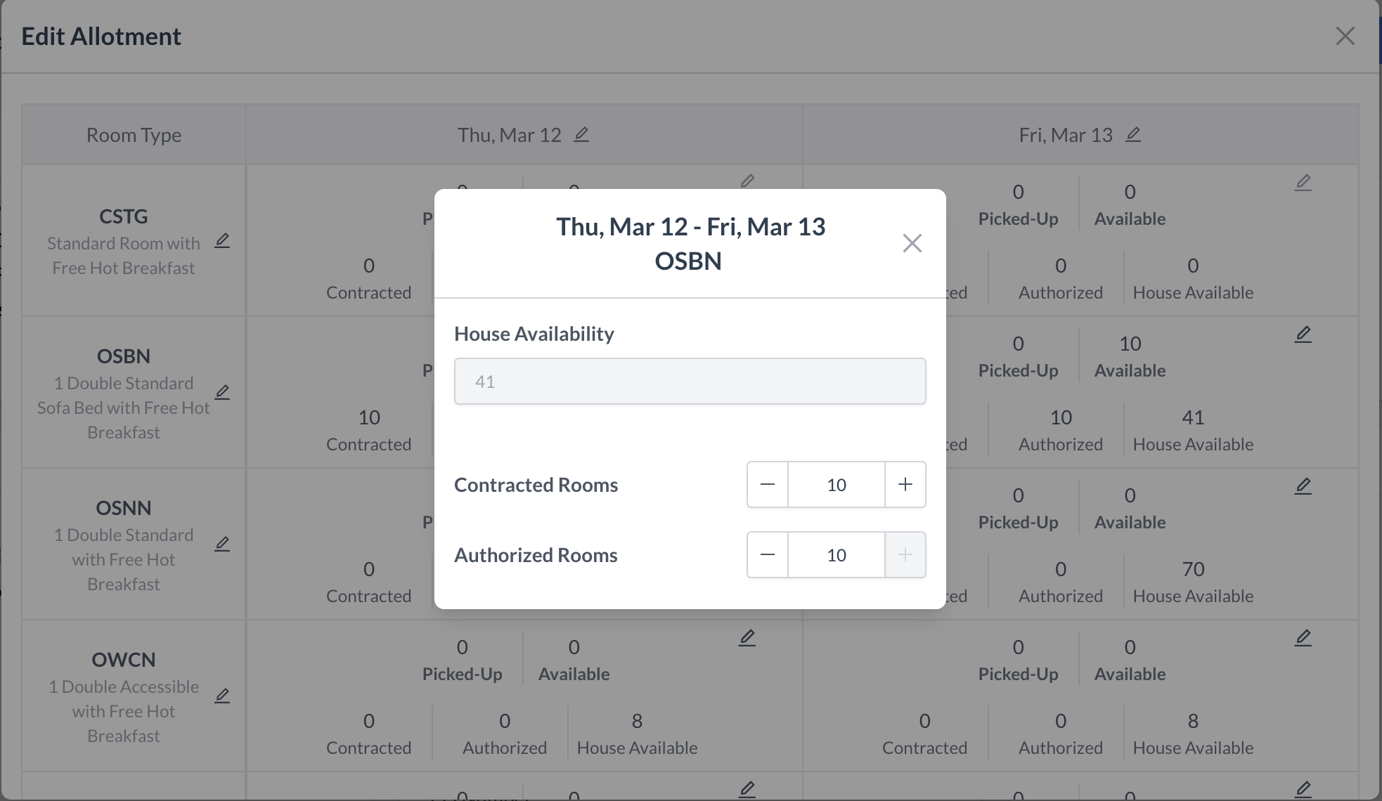 View and adjust room allocations by room type and date