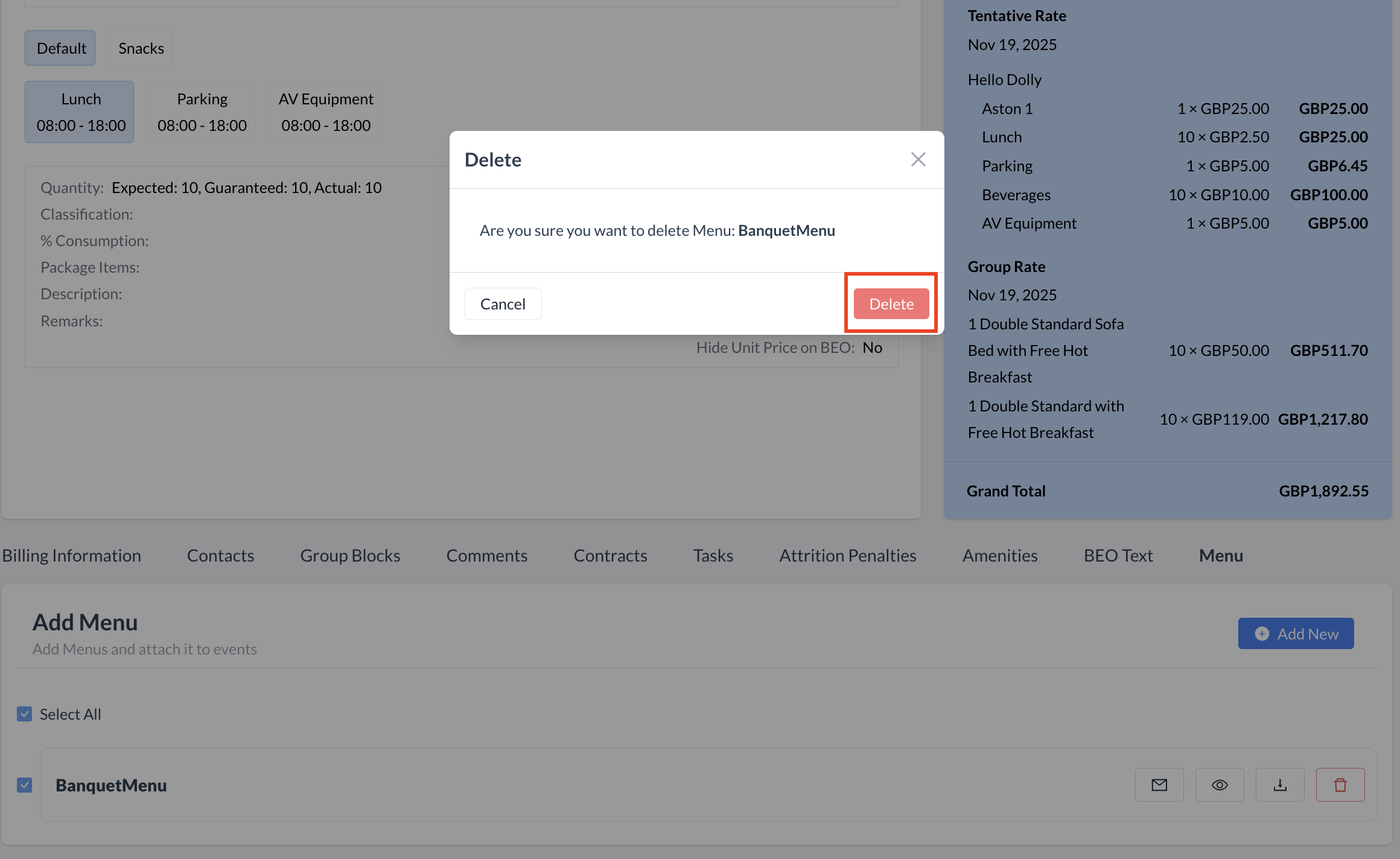 Managing the Banquet Menu in the Event RecordOnce a menu has been attached to the Event Record, it will appear in the Menu section. A toolbar will be displayed with the following action buttons: