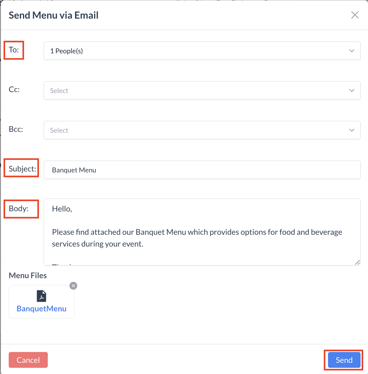 Sending the Banquet Menu via EmailYou can easily email the selected banquet menu to your client directly from the Event Record. Steps to Send the Menu: