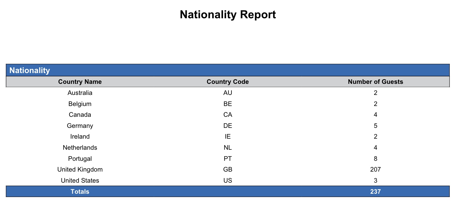 Report Description: The Nationality Report presents a count of guests categorized by their country of origin, including both the country name and its corresponding country code, for a specified duration of stay.