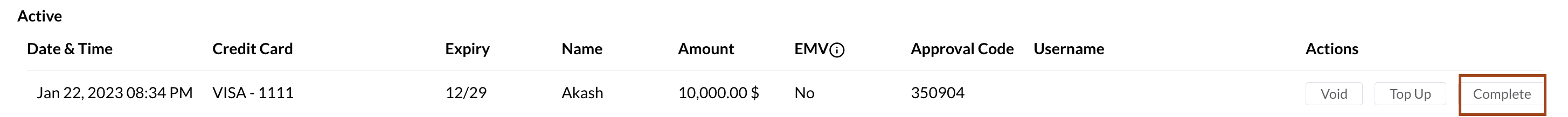 In the Authorization screen displaying all active authorizations with options to View, Void, Top Up, or Complete. Locate the applicable authorization and select Complete. Confirm the action by selecting Complete again. A Success message displays once the authorization is completed. | ![]() ![]() |
