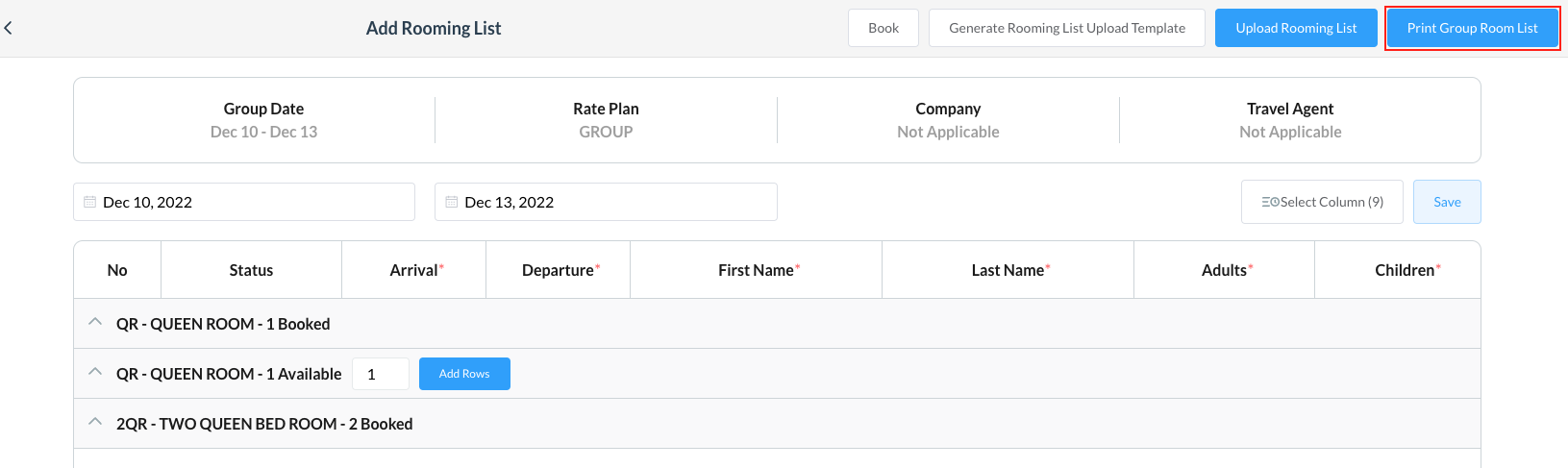 The Add Rooming List screen opens Click on Print Group Room List option shown at the top right corner of the screen | ![]() |