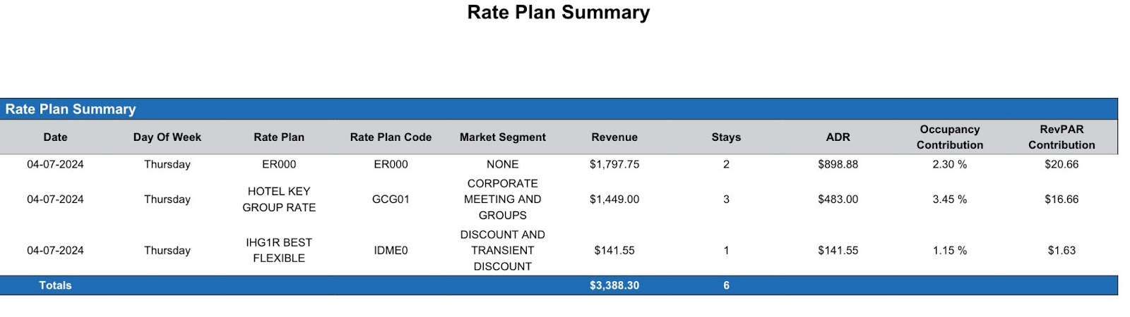 Report Description: The Rate Plan Summary report provides revenue, stays, ADR, occupancy contribution and RevPAR contribution statistics by rate plan for a defined date.