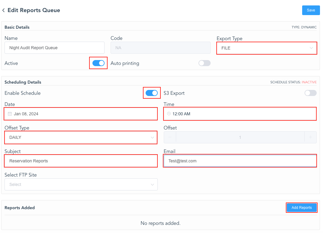 On the Edit Reports Queue page, select the parameters you desire for this scheduler.