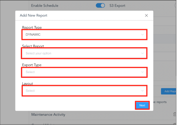 Select the applicable type of Report Type, Report, Export Type, and Layout associated for the report you desire. When completed, select Next | ![]() |