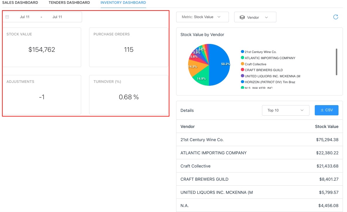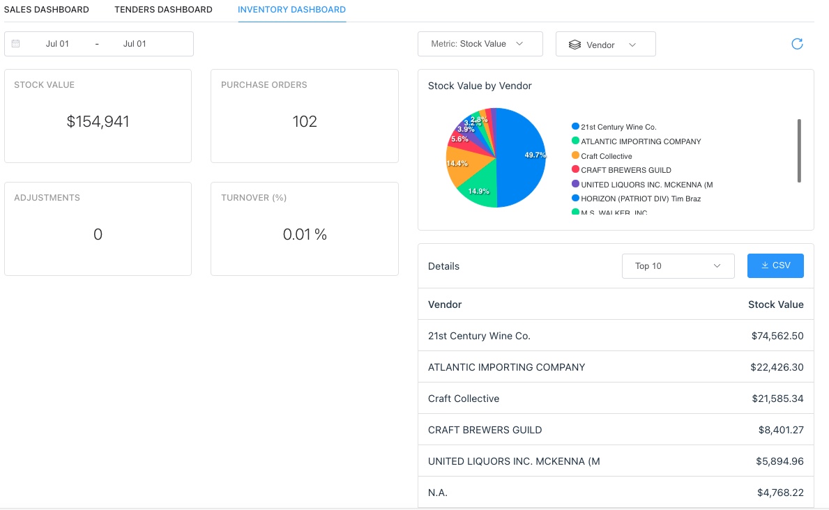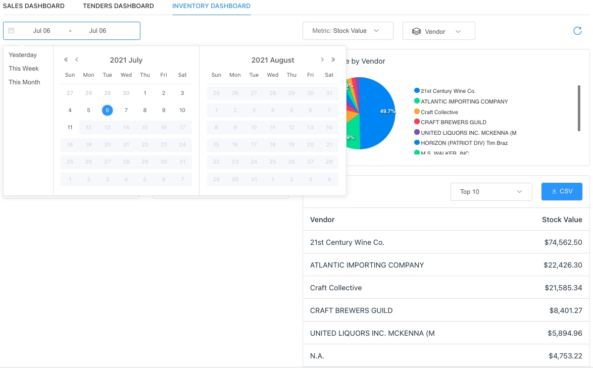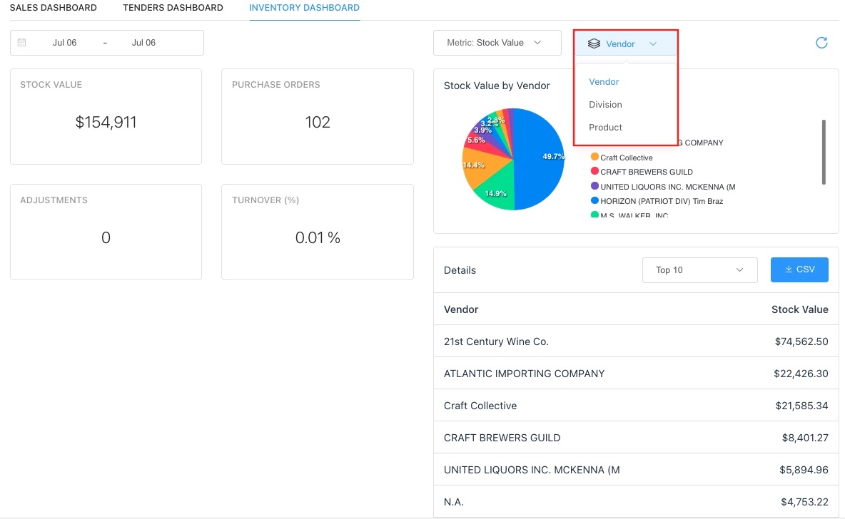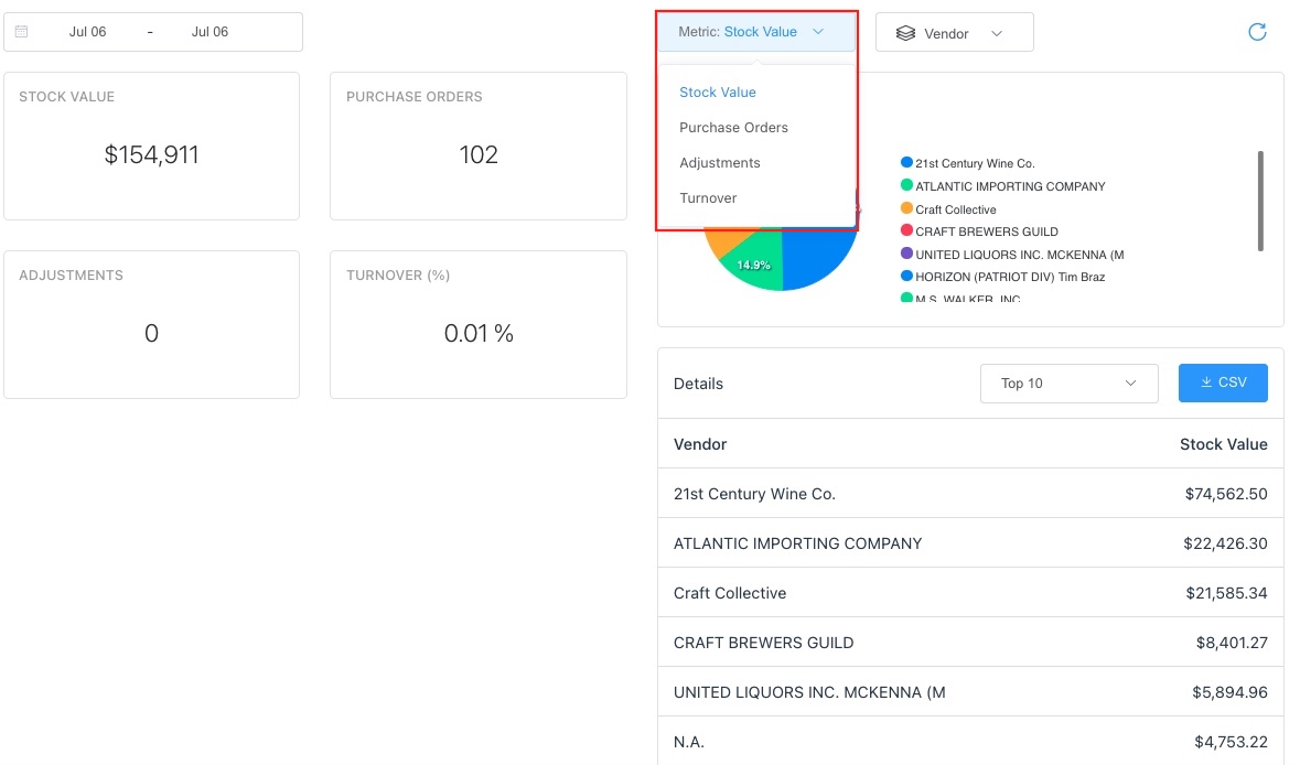 In the is example, we are selecting the date of Jul 01 for the metric of Stock Value by Vendor Once the results are populated on screen, you can also further scrutinize the details by Top 10, Bottom 10, Top 50, or Bottom 50 |