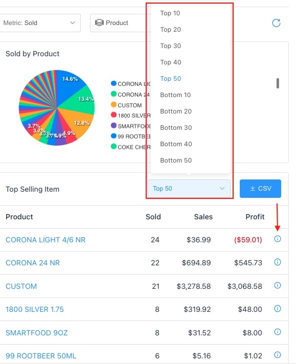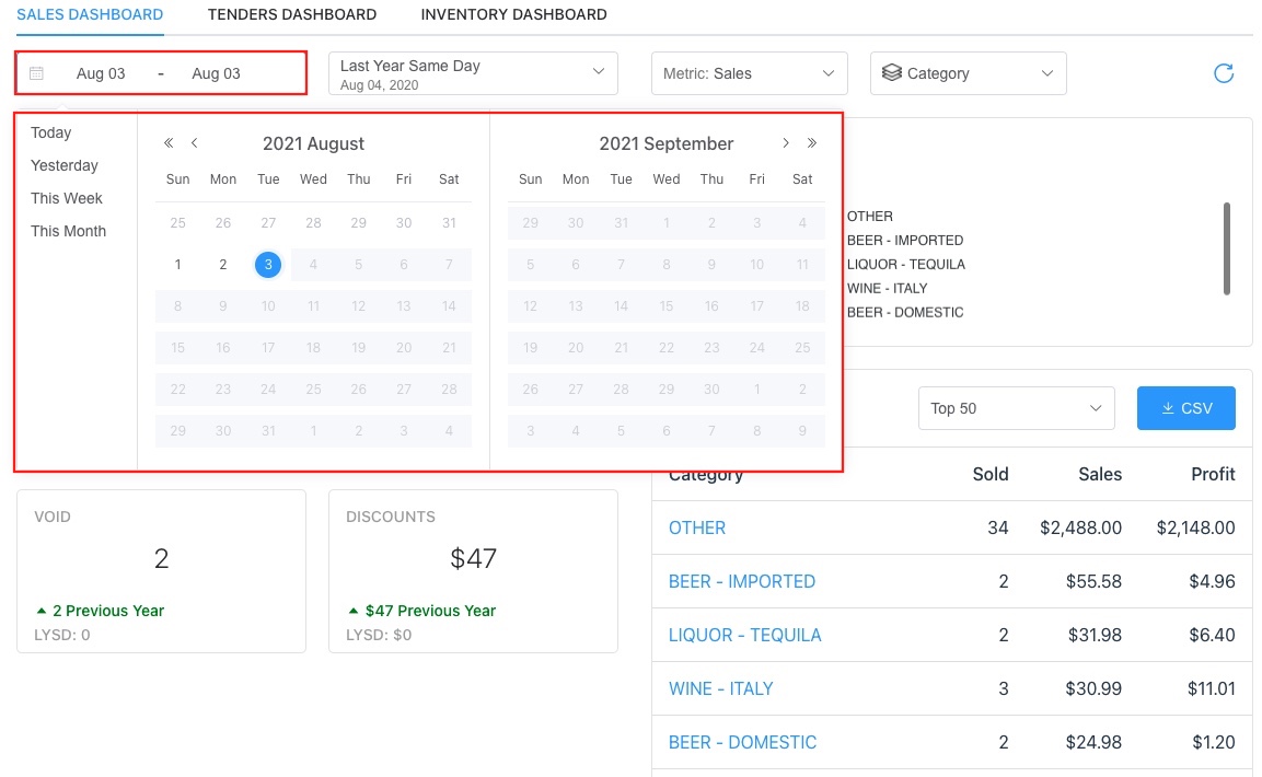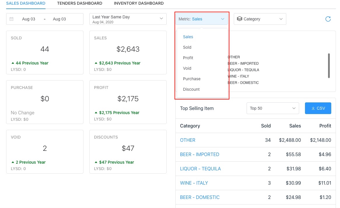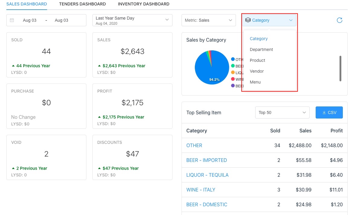 You can also search by the metrics: Category, Department, Product, Vendor or Menu | |