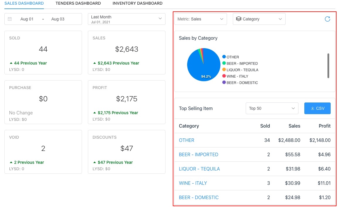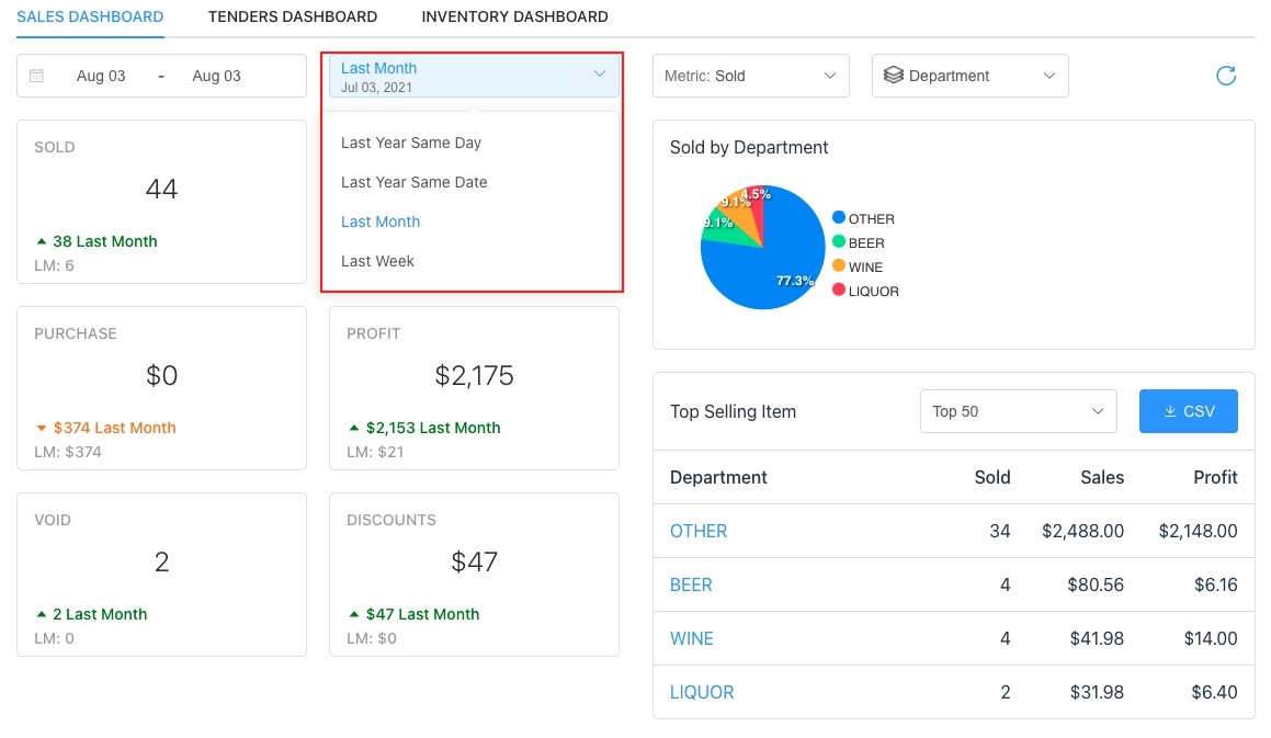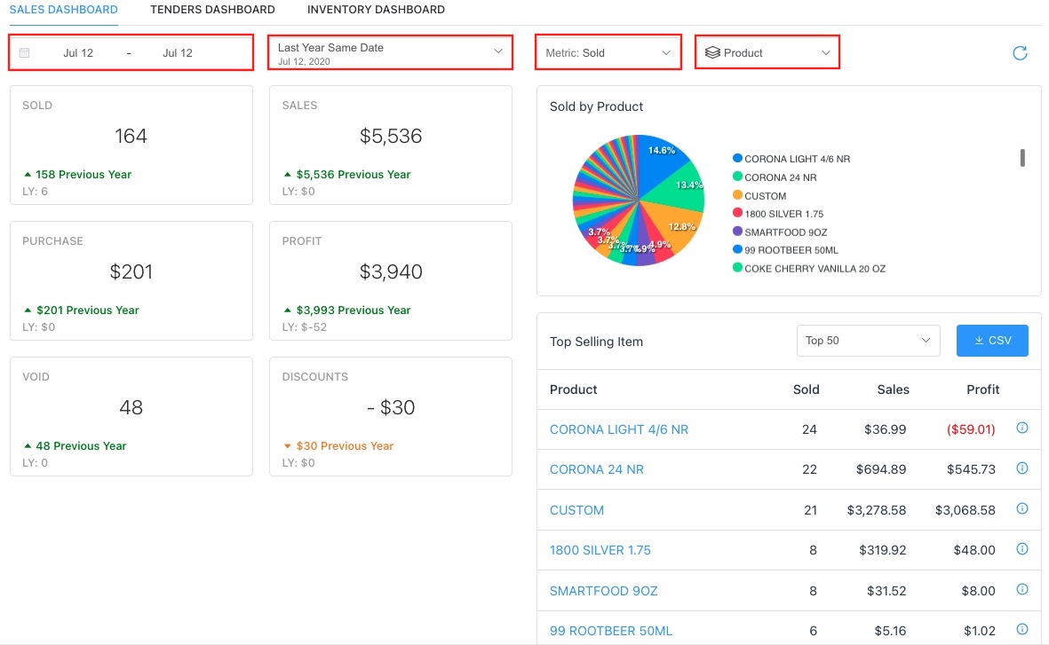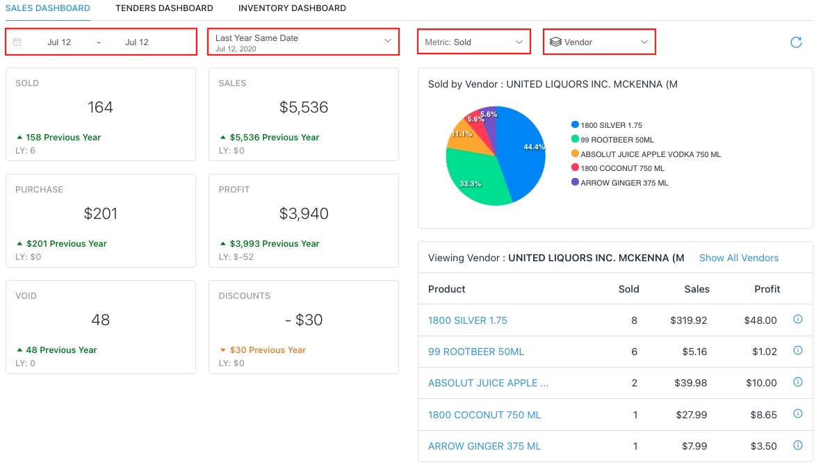 A complete Dashboard snapshot will reflect all the criteria chosen from the options available: Here, we chose the date of Jul 12 compared to Last Year Same Date for the Metrics Sold and Vendor: | |