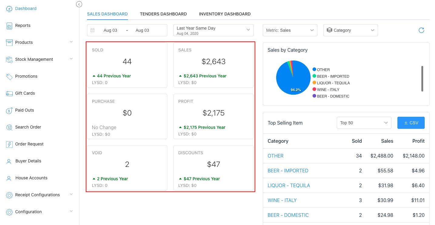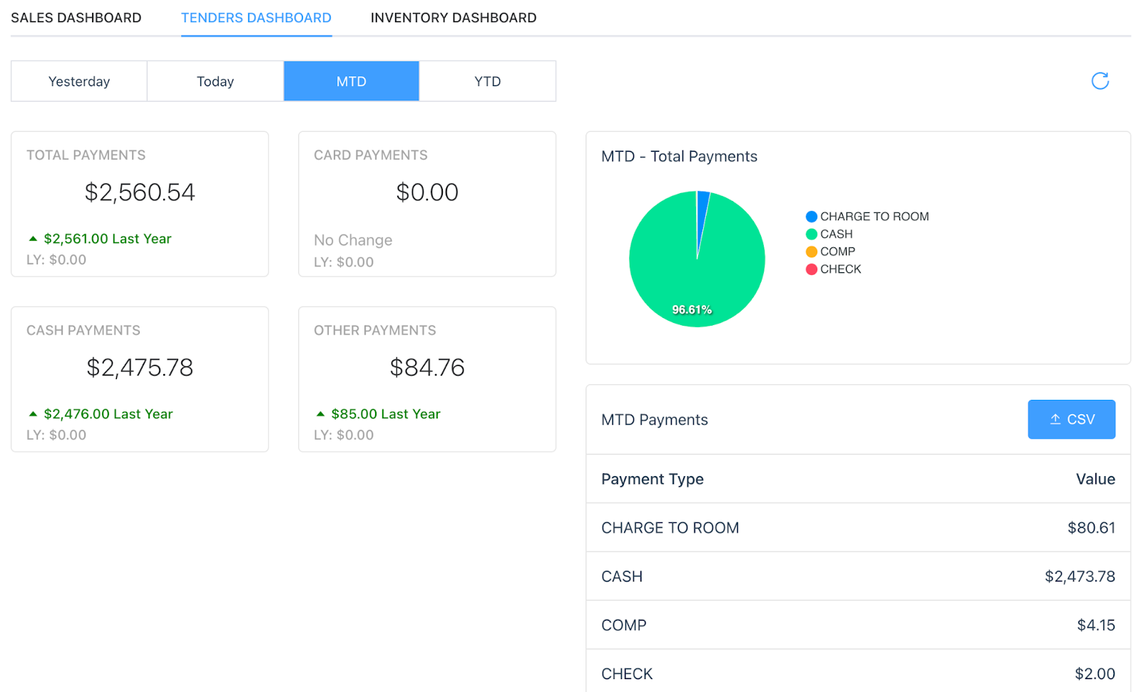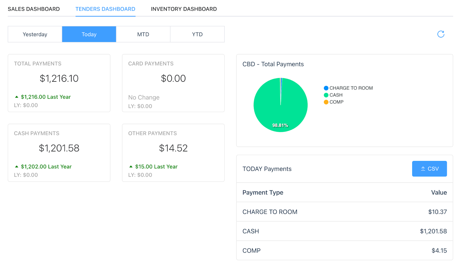 The Tenders Dashboard screen provides a snapshot of the tender sales by Yesterday, Today, MTD, and YTD as well as Payments | |