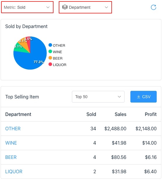 By choosing any of the search criteria listed from the dropdown, you can see the numbers reflected in the pie chart image and the resulting list below that. In the example shown here, we have selected to search by the Sold Metric and by Department: | |