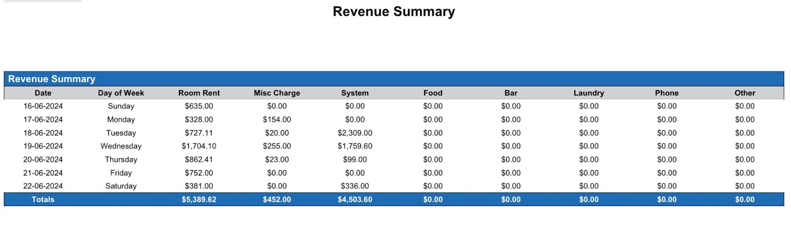Report Description: The Revenue Summary report offers property managers a comprehensive overview of total revenues generated across various revenue streams and outlets for specific dates, aiding in the assessment of overall financial performance.