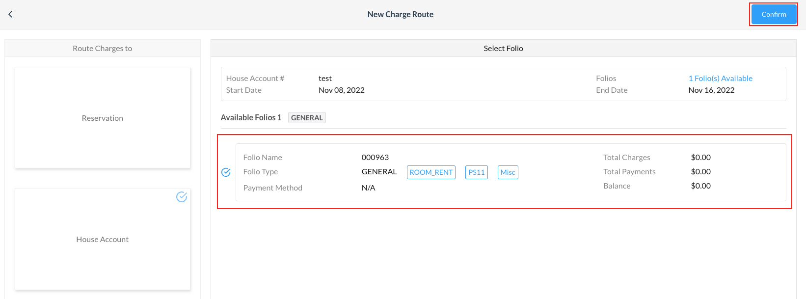 New Charge Route screen populates Choose where you would like to route the selected charges - another Reservation, a House Account or a Group Master In this example, we have chosen to route the charges to a House Account | ![]() |