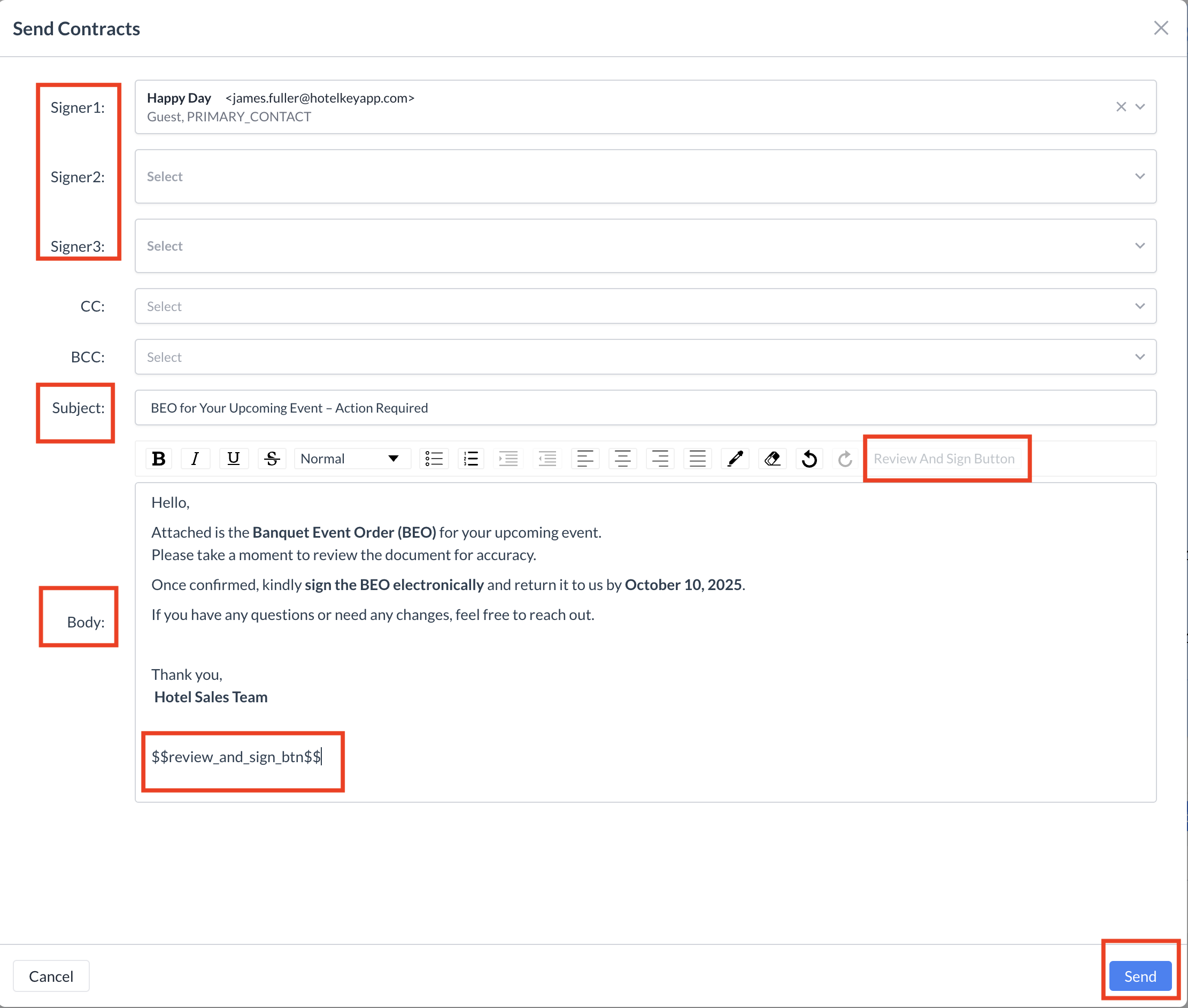 Once everything is configured, click the blue "Send" button to email the BEO to your selected signers.