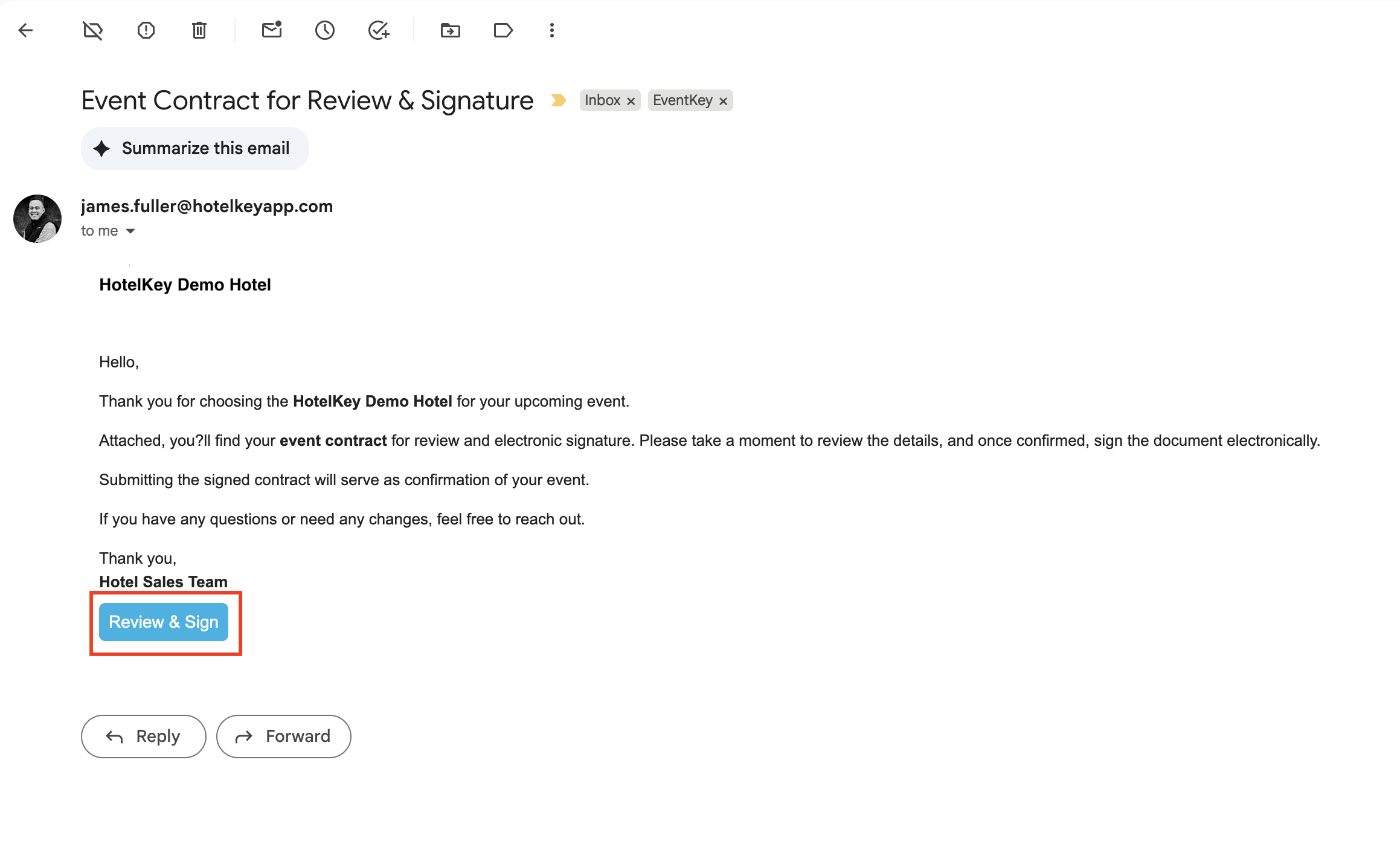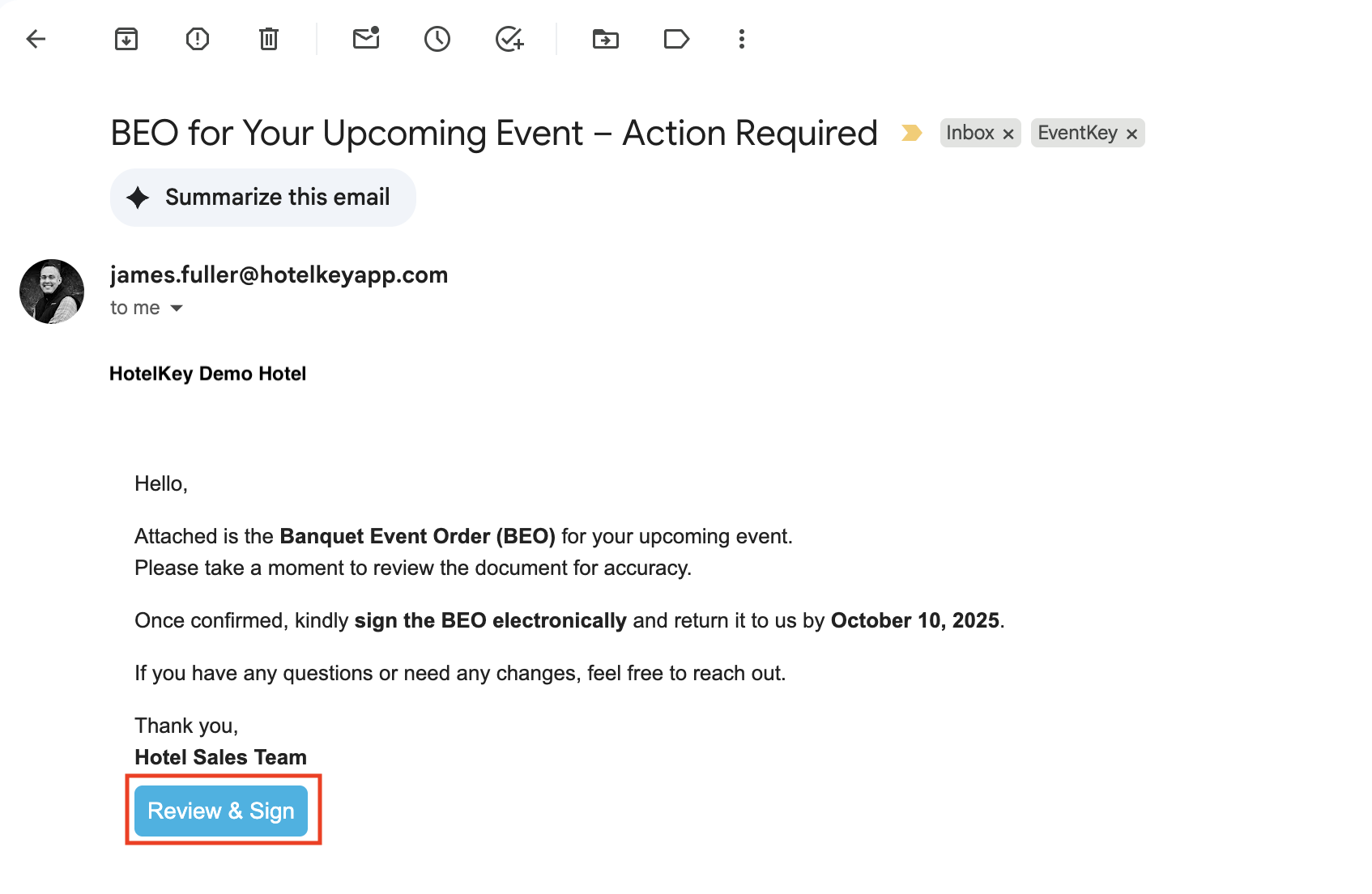 The signer(s) will receive an email with the BEO directly in their inbox.