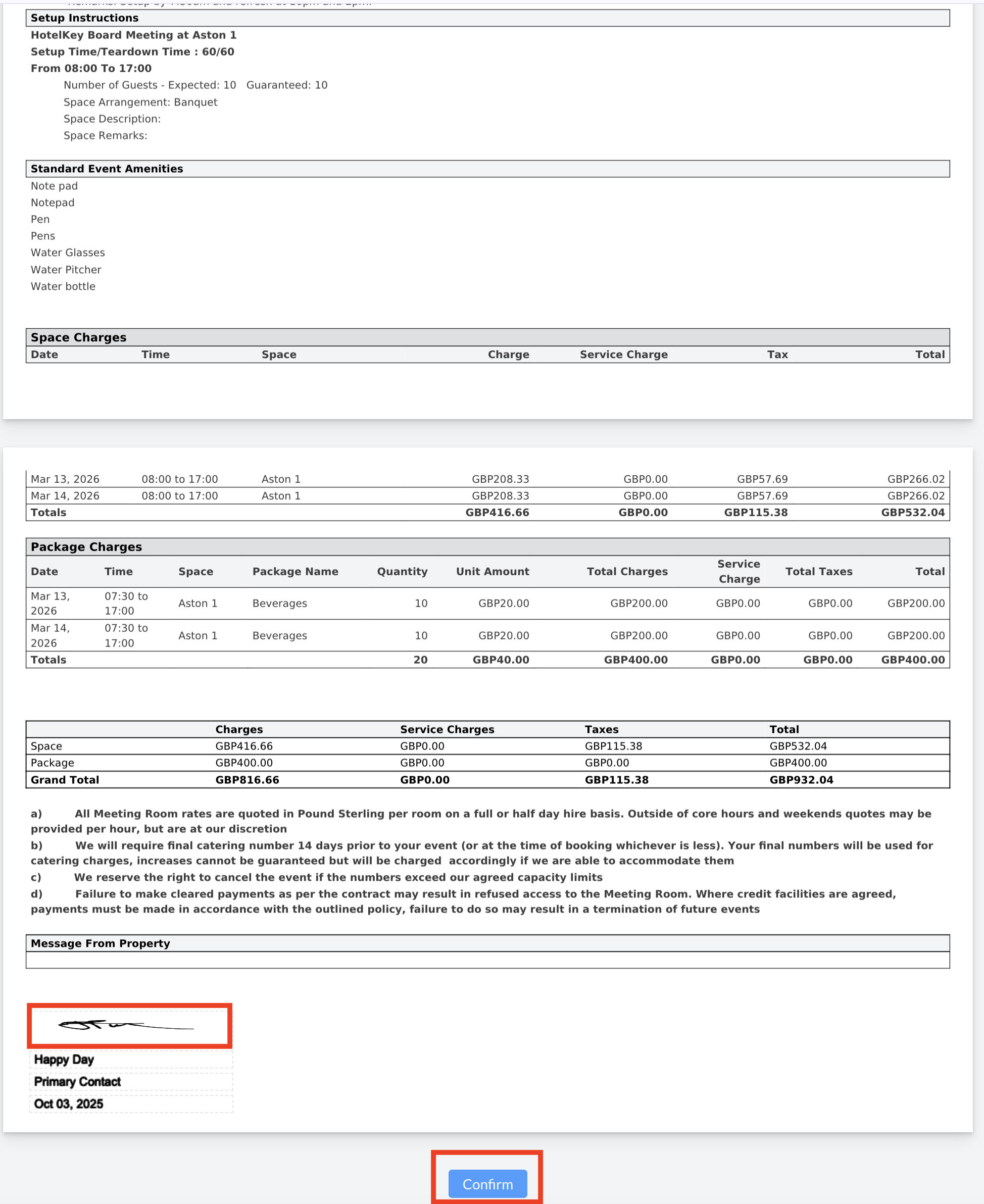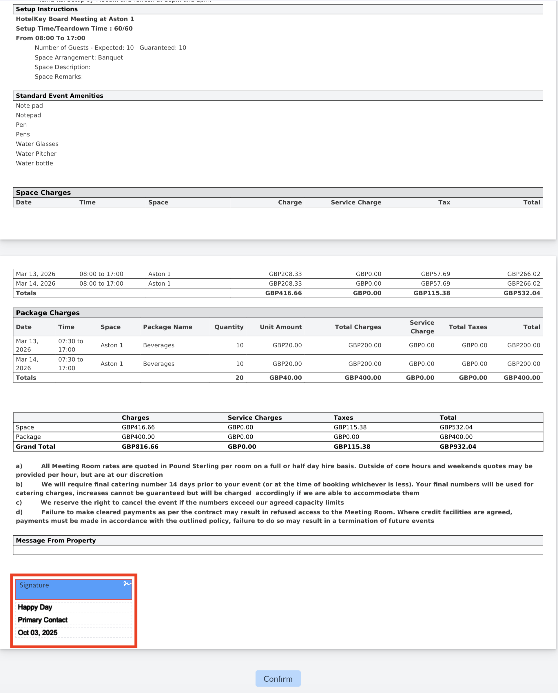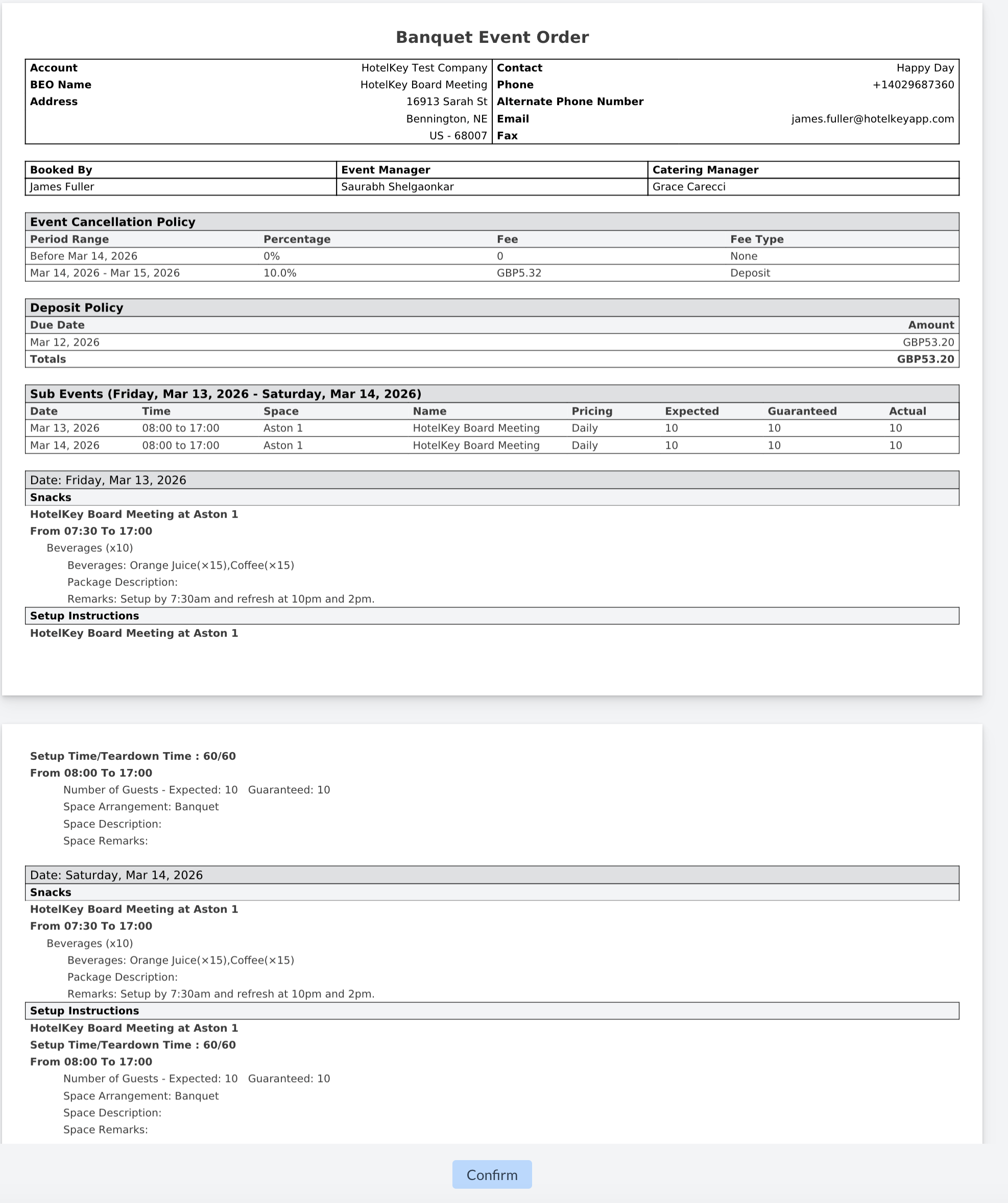 To complete the process, they must click the blue "Confirm" button at the bottom of the BEO.