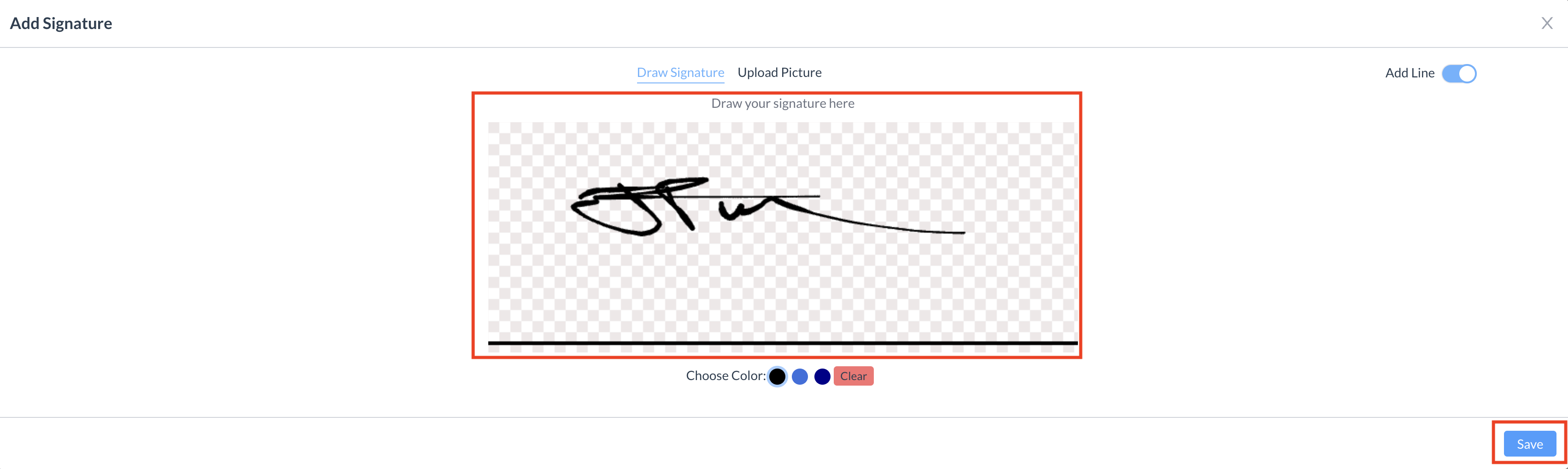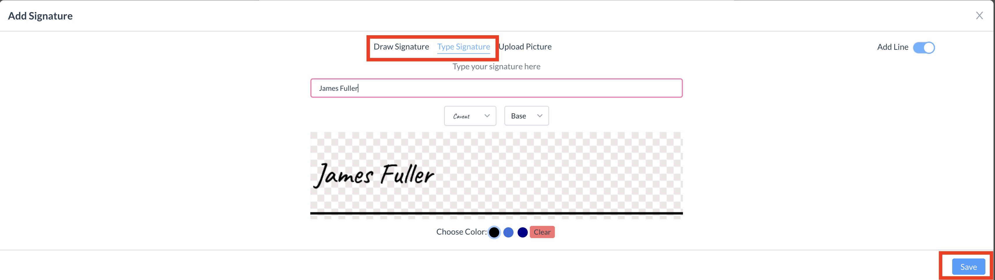 Save the Signature After entering their signature, the signer clicks the blue "Save" button.