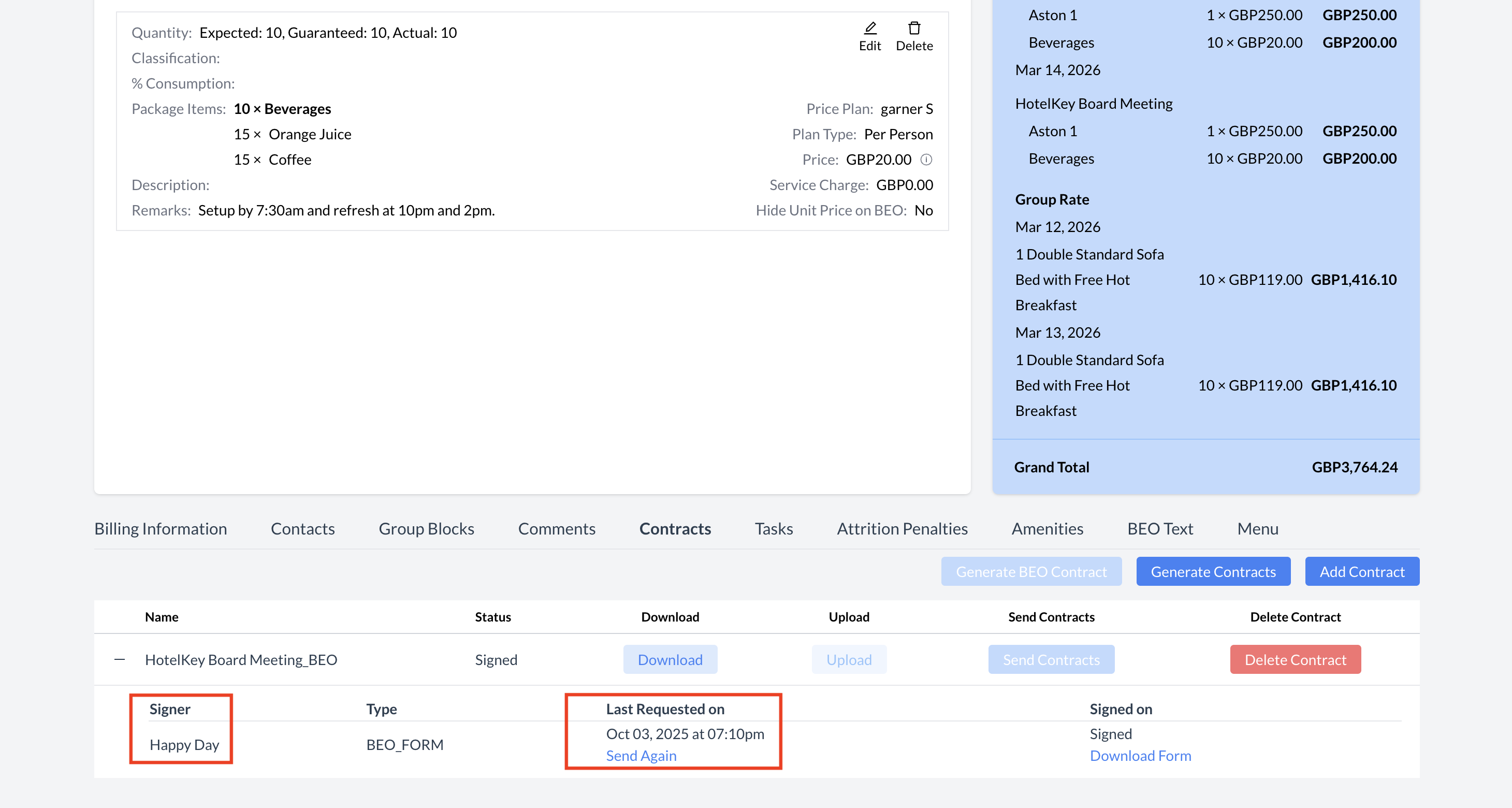 If a signer has not yet signed, you can click the blue “Send Again” button to resend the BEO.