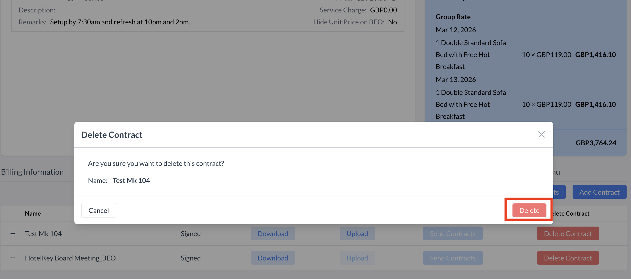 You can delete a BEO or Contract at any time, even if the document has already been signed. This may be necessary if updates are required or an error needs correction.