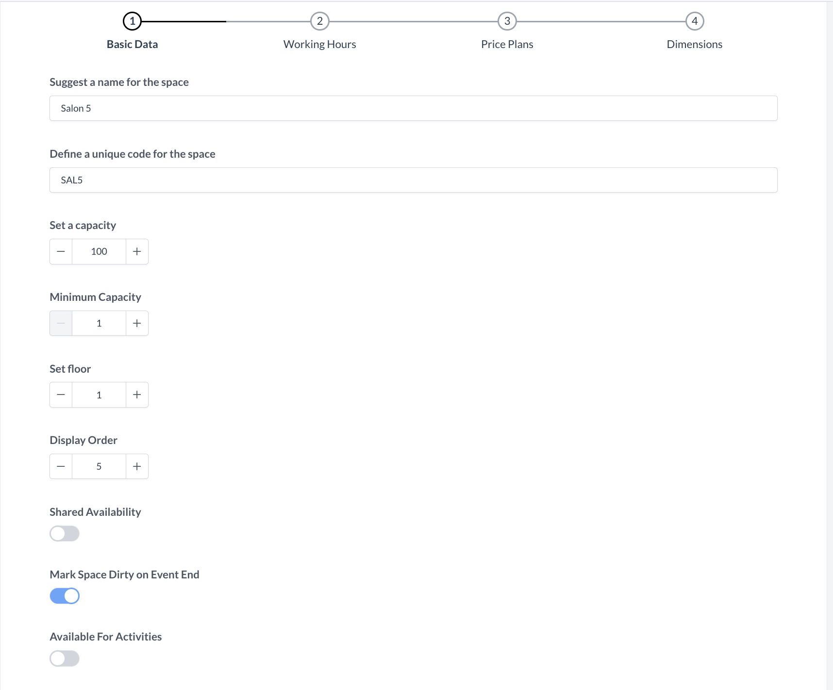 Step 2: Set Working Hours for the SpaceIn this step, you will define the daily availability of the space by setting working hours for each day of the week. 🔹 Enable or Disable Days of the WeekBy default, all days are enabled for availability.