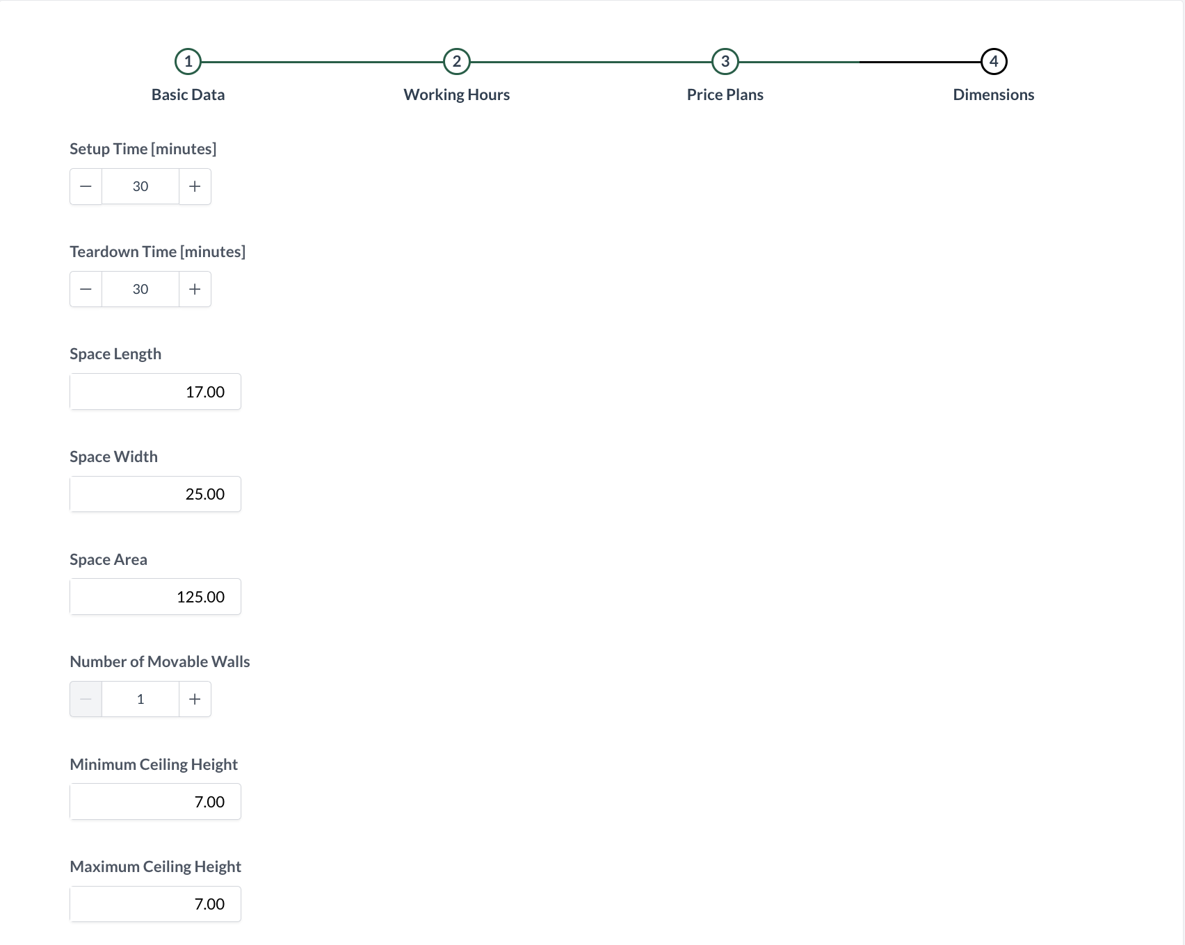 Step 4: Configure Space Dimensions (Optional)In this step, you can enter detailed information about the space’s dimensions and attributes. If you prefer not to enter this information, scroll to the bottom and click the blue Save button to continue. Space Configuration Fields