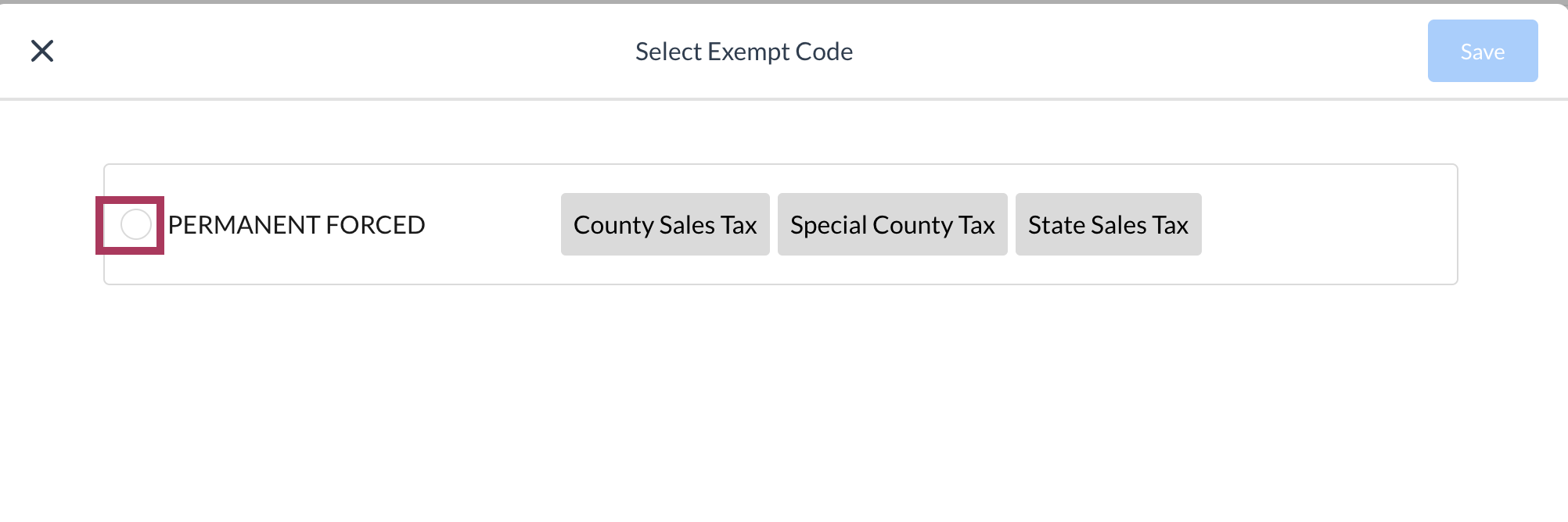 Se cerrará la ventana emergente Seleccionar código exento. De nuevo en la ventana emergente Exento de impuestos, ingrese opcionalmente Notas. Seleccione Aplicar exención de impuestos para guardar las selecciones y cerrar la ventana emergente. | ![]() |