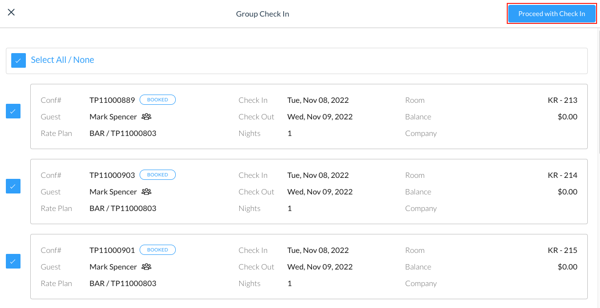 Se abre la pantalla de Check In de grupo Seleccione las reservas que desee registrar utilizando la casilla de verificaci贸n Haga clic en Continuar con el Check In | ![]() |