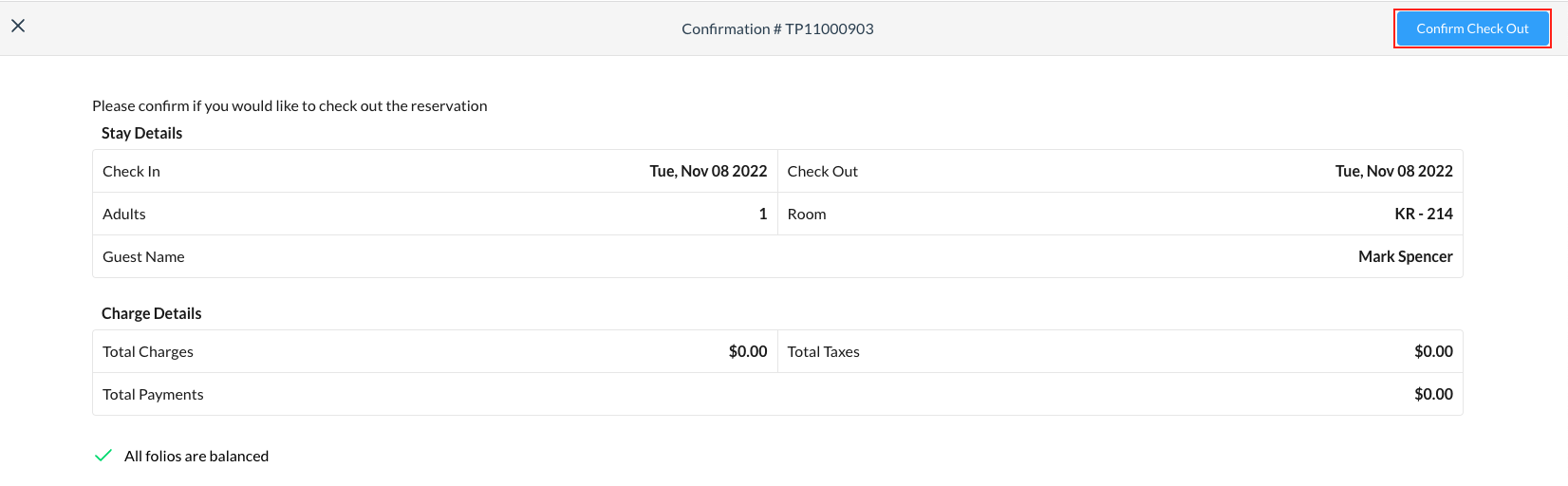 Se activa una ventana emergente de confirmación final que contiene los detalles de la reserva. Observe el mensaje “Todos los folios están saldados” en la parte inferior izquierda de la ventana emergente. Seleccione Confirmar Check Out. | ![]() |