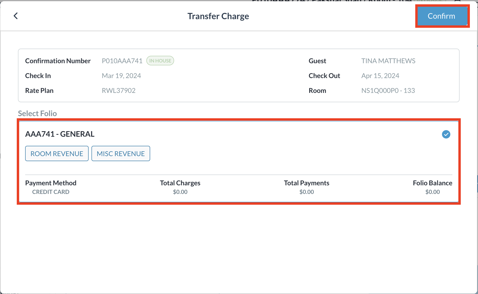 Se muestran los detalles de los Folios disponibles. Seleccione el Folio correspondiente al que desea transferir el cargo y luego seleccione Confirmar. | ![]() |