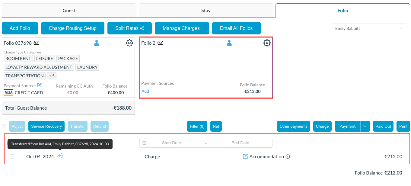 Este artículo cubre cómo transferir cargos a un Folio en la Misma Reserva.