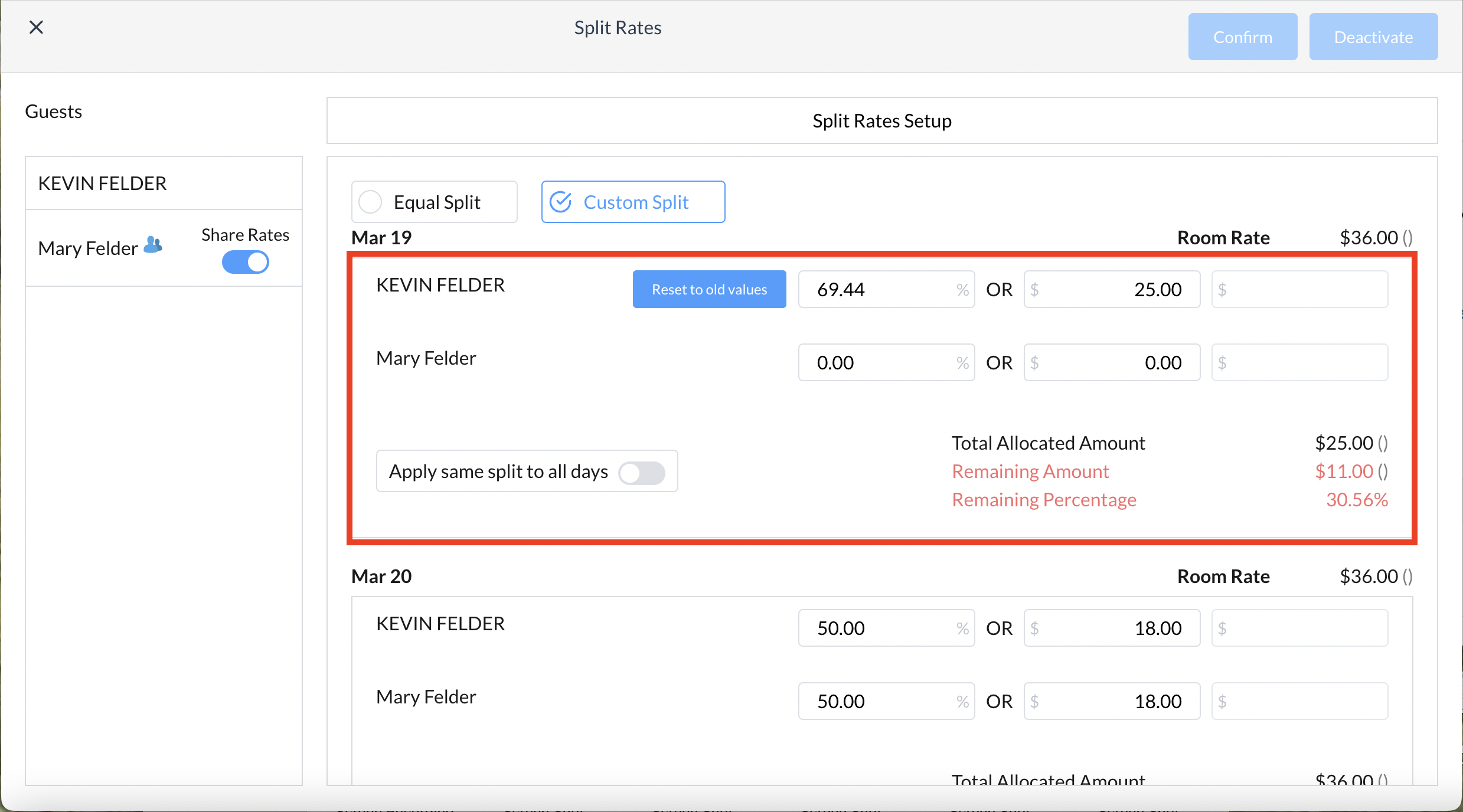 Select Custom Split - split rates setup screen loads Split by Percentage In the example to the right, the first guest is responsible for 60% - once entering the initial percentage, notice the total allocated amount shows the remaining balance - the remaining guest(s) need to be setup for 40% split to balance the split rate setup Choose to Apply same split to all days or manually enter the split for the remaining days, if applicable, to complete the setup | ![]() ![]() |