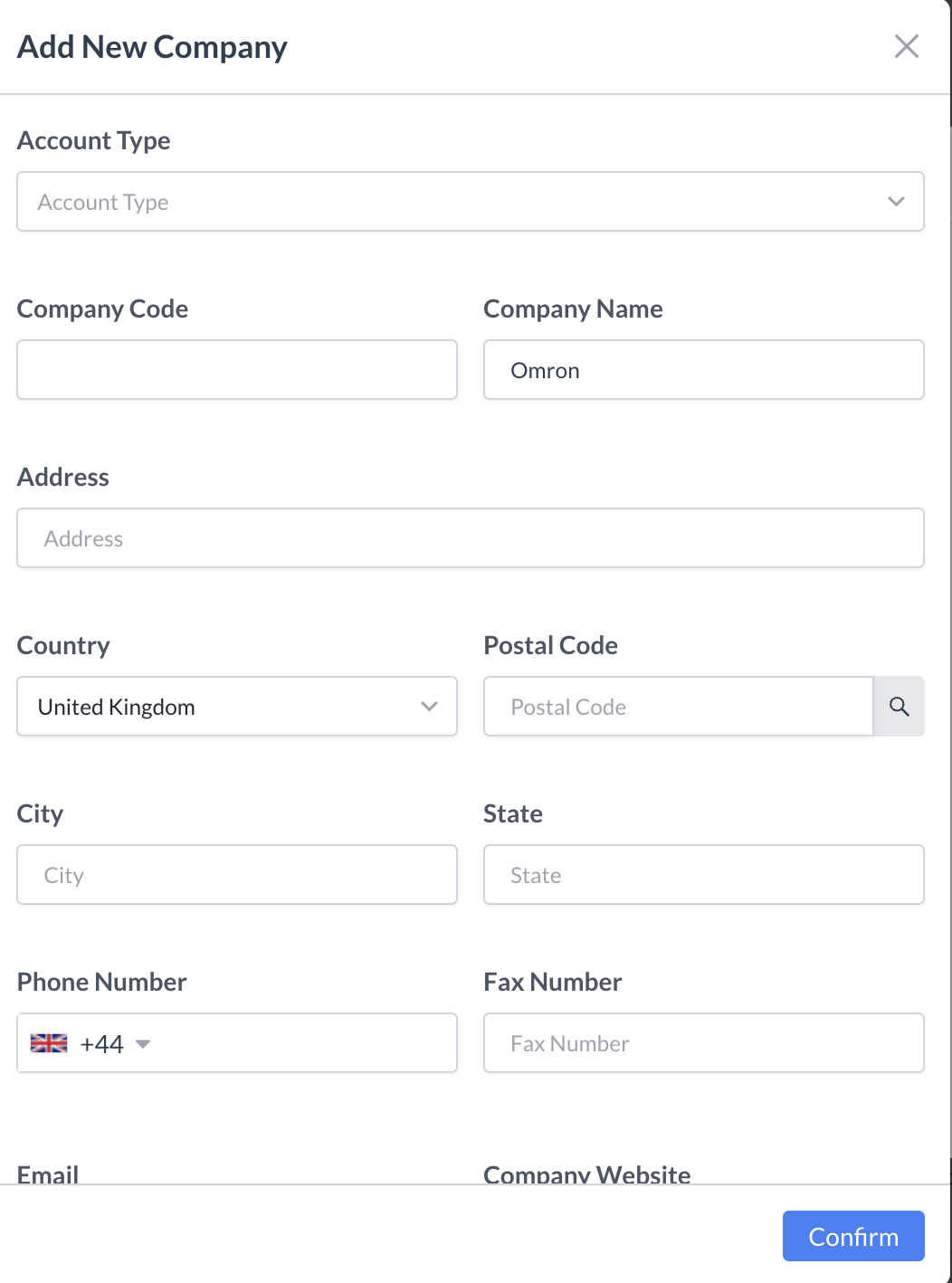 Confirm: Enter the required company details and click the blue Confirm button to save the profile and link it to your task.
