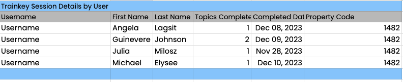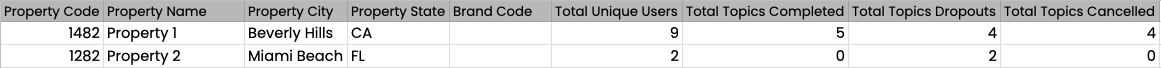 Report Purpose: Help the enterprise understand all active properties that are utilizing TrainKey, their number of unique users with topics completed and canceled