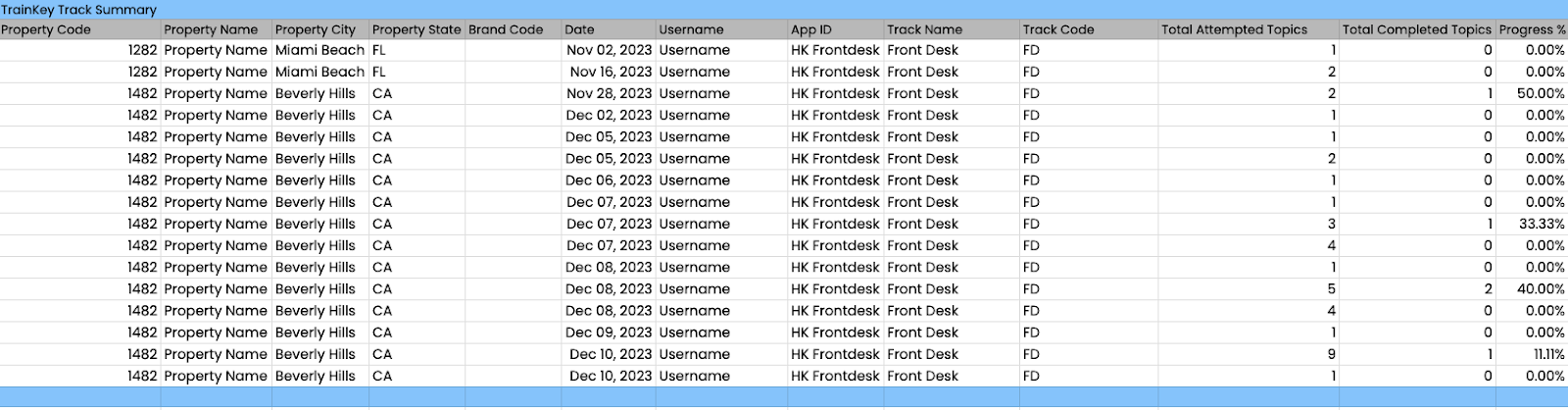 Report Purpose: To help the enterprise understand all of the users’ progress across different tracks in HotelKey