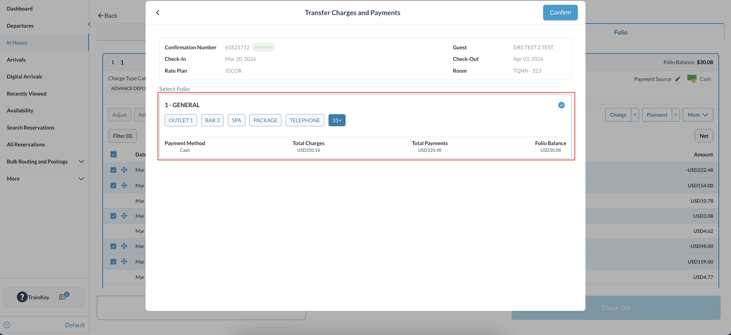 Select the destination folio and confirm the transfer to complete the process. | ![]() |