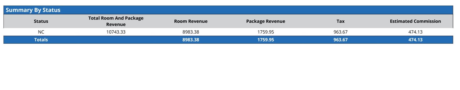 Estimated Commission | Estimated amount of commission to be paid to the travel agency | Not Applicable | =sum(commission rate) x (total room and package revenue) |