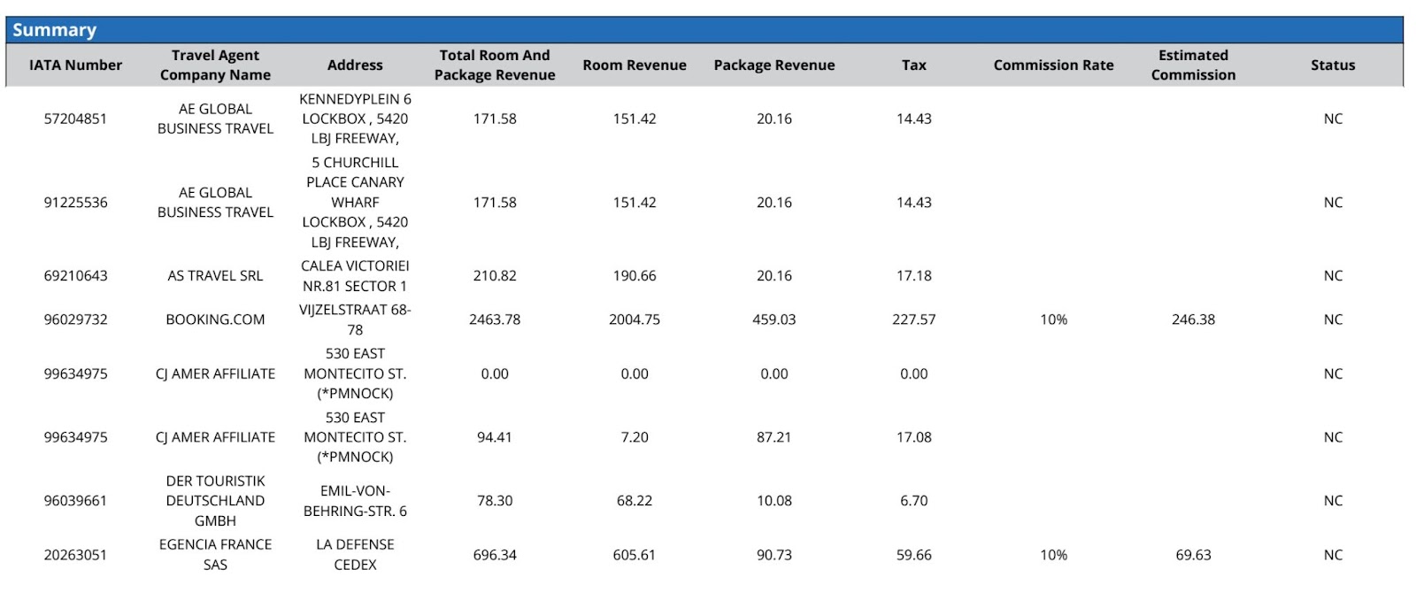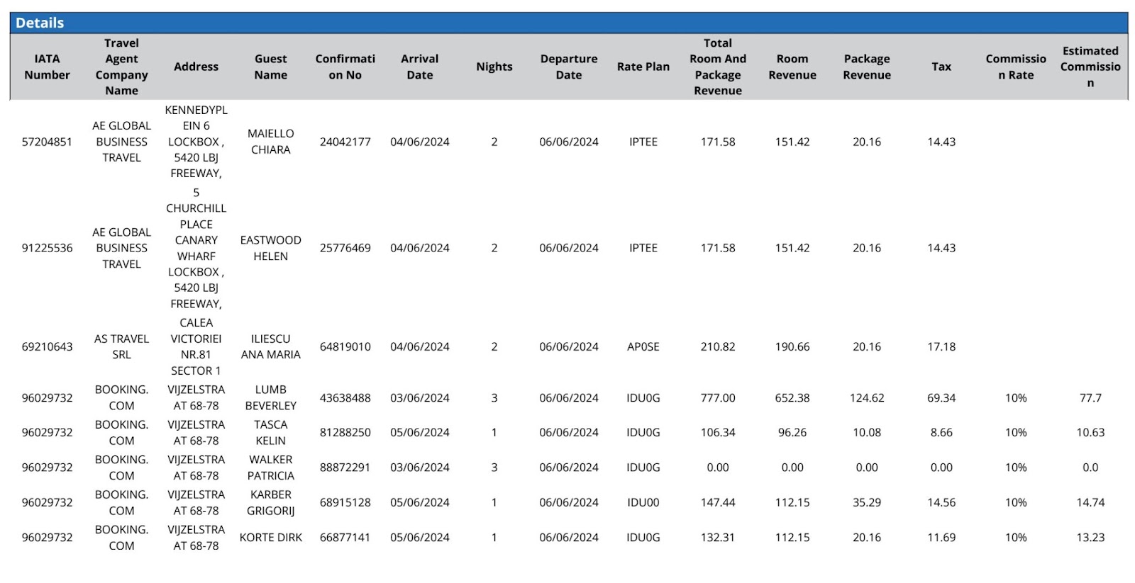 Report Description: Provides a list of reservations made by travel agencies. Report includes IATA number, guest name, stay details, rate details and commission details.
