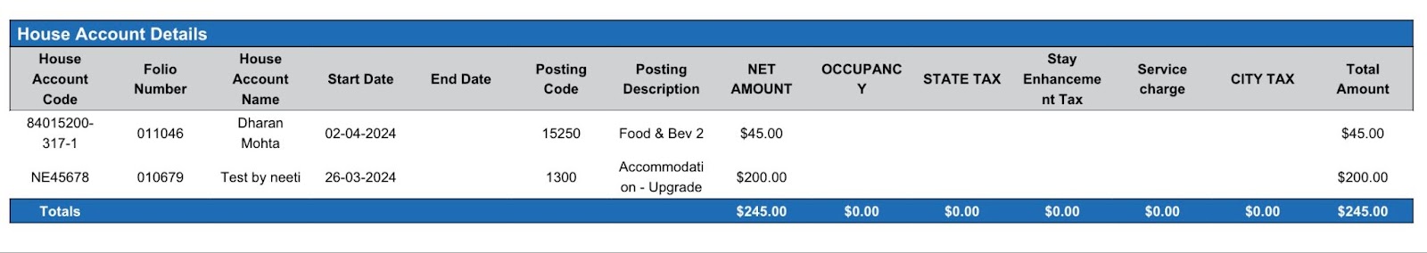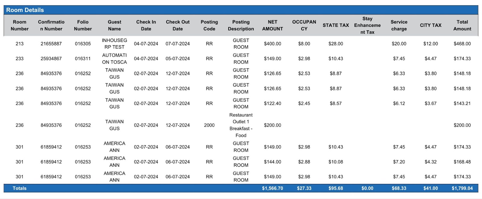 Room Details section: provides a list of uninvoiced transactions by room number with posting code and description.