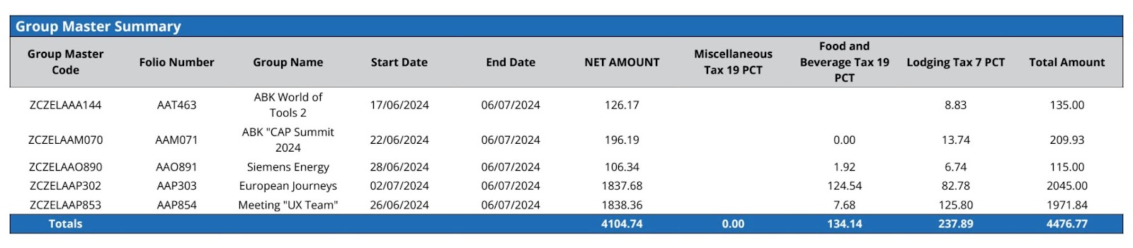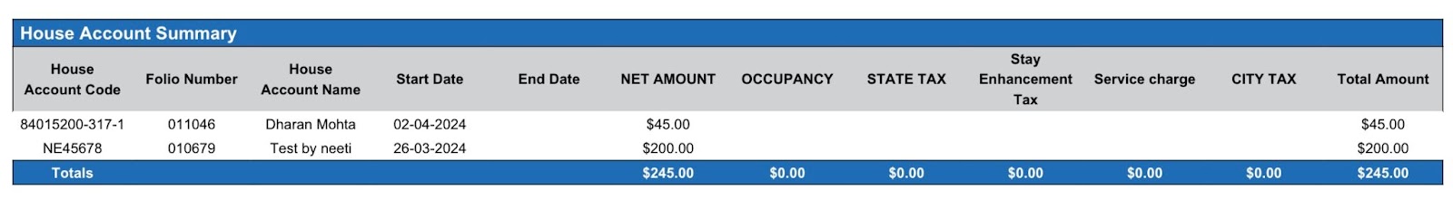 Report Description: The Uninvoiced Transactions report provides a list of transactions that have not been billed, including confirmation number, folio number, guest name, stay, and rate details, aiding property managers in identifying unbilled charges. This report includes transaction data for House Accounts, Group Master, Room Summary, House Account Summary, Group Master Summary, Per Tax Code.