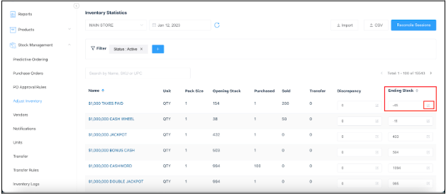 To update Current stock select the Edit icon in the Ending Stock column | ![]() |