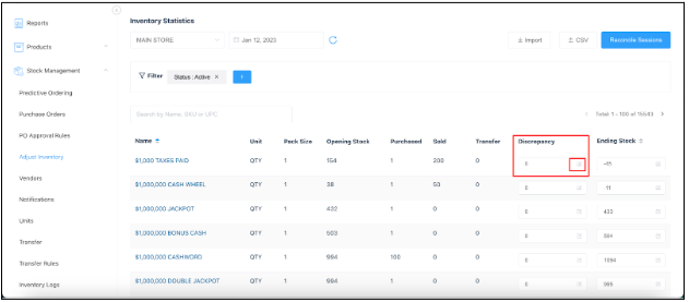 To update and discrepancy to stock, select the Edit icon in the Discrepancy column.