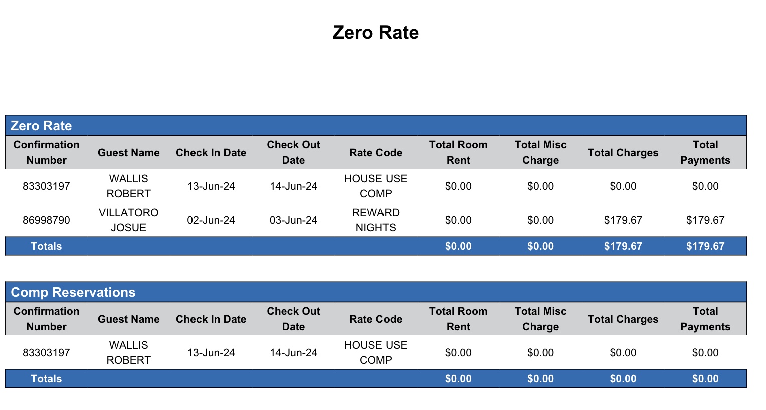 Report Description: The Zero Rate Report provides a list of reservations with a zero rate applied. This report is useful for tracking reservations where no room charges were incurred. This report helps hotel staff identify reservations with zero rates and ensures accurate billing and accounting procedures.
